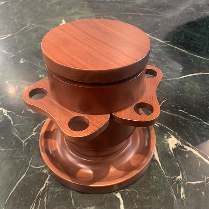 A tobacco storage jar-pipe stand of exceptional quality made of solid natural wood. Holds upto 6 pipes.