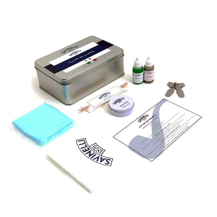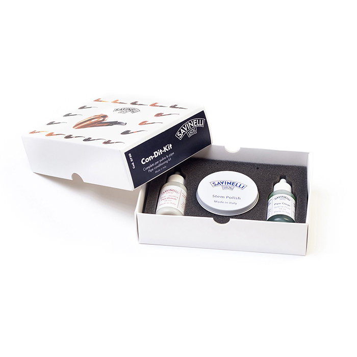 Convenient tin box with Savinelli logo to collect everything needed for cleaning and maintenance of the pipe. The package is composed of Nikosolvol 18ml (to clean the inside of the pipe), Pipe Polish 18ml (to clean the outside of the pipe), Stem Polish (paste used to clean ebonite tapered stems), adjustable pipe reamer, pipe cleaners 3 pcs, 2 cloth for spreading the products, white cloth for polishing.