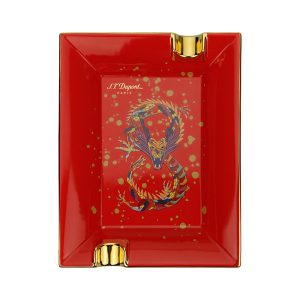 This ashtray features a sleek, rectangular design with gently sloped sides and two cigar rests. The glossy burgundy porcelain surface is adorned with a vibrant dragon illustration, symbolizing strength and elegance. Hand-applied gilded accents add a touch of luxury, making this ashtray a statement piece for any cigar enthusiast.