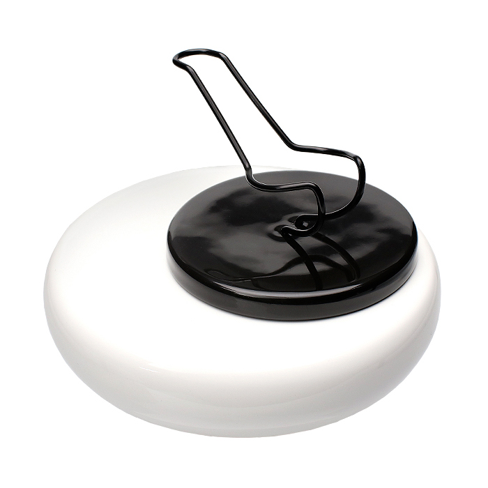 A refined ceramic accessory for pipe smokers, this set includes a round ashtray with an integrated cork pipe knocker and a “Seggiolina” metal pipe stand that fits seamlessly into the ashtray’s design. A perfect combination of form and function.
