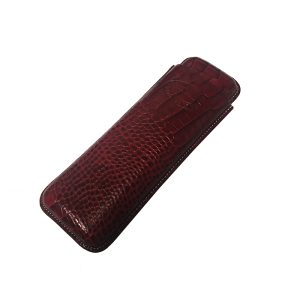 Cow hide leather in a deep red finish with alligator motif. Hold upto 2 double corona cigars.