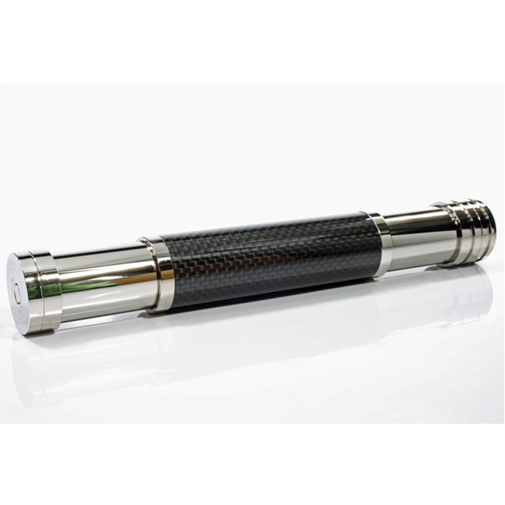 This patented cigar tube made by Magic is a high tech toy for men. The tube melds a beautiful design with intelligent functions. The lenghts of the tube is variable, closed it is suitable for Robusto cigars, extended even a 184mm long Churchill with a diameter of 23mm fits perfectly. In the cab a 6mm round cutter is included. The base material is chrome-plated brass, the outer material is real carbon. The 145 g heavy tube delivers the perfect protection for your quality cigars.