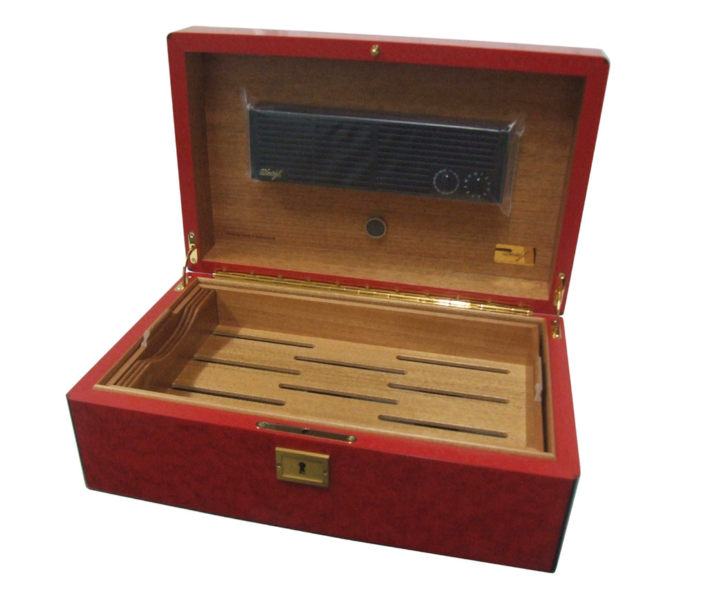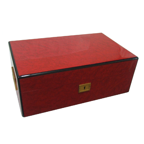 This striking humidor with Its brilliant red maple finish and strong fittings provide an elegant home for larger quantities of cigars (75 – 90 cigars). A must-have for the most passionate cigar aficionados. With Lock, Handles and Tray. Inside Dimensions: 13¾ x 7¾ x 4¼ and Outside Dimensions: 15 x 9¼ x 5¾