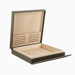 The S.T. Dupont 1356 Khaki Travel Humidor combines luxury and functionality, offering a compact solution for cigar enthusiasts on the move. Its khaki grained leather exterior and solid Okoumé wood interior ensure durability and style. The top-to-bottom magnetic opening system provides easy access, while the humidor’s compact dimensions make it ideal for travel.