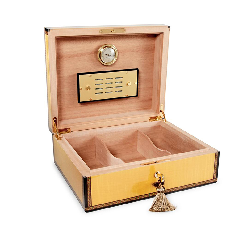 This Elie Bleu Medals Yellow Sycamore 75 count Humidor comes with one Elie Bleu humidifier & one Elie Blue hygrometer.