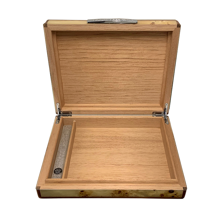 Travel humidor in piano finish poplar burl and lined with Spanish cedar to help keep your cigars fresh. Humidifier included. Dimensions – L235 x W195 x H48mm