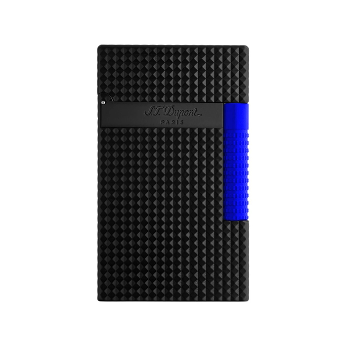 The Grand Dupont features a diamond-tipped guilloche, a semi-matte black finish with a silky feel, and a striking fluorescent blue trigger. Its dual-flame system includes a gentle low flame for gradual cigar heating and a powerful torch flame for optimal ignition in any condition.